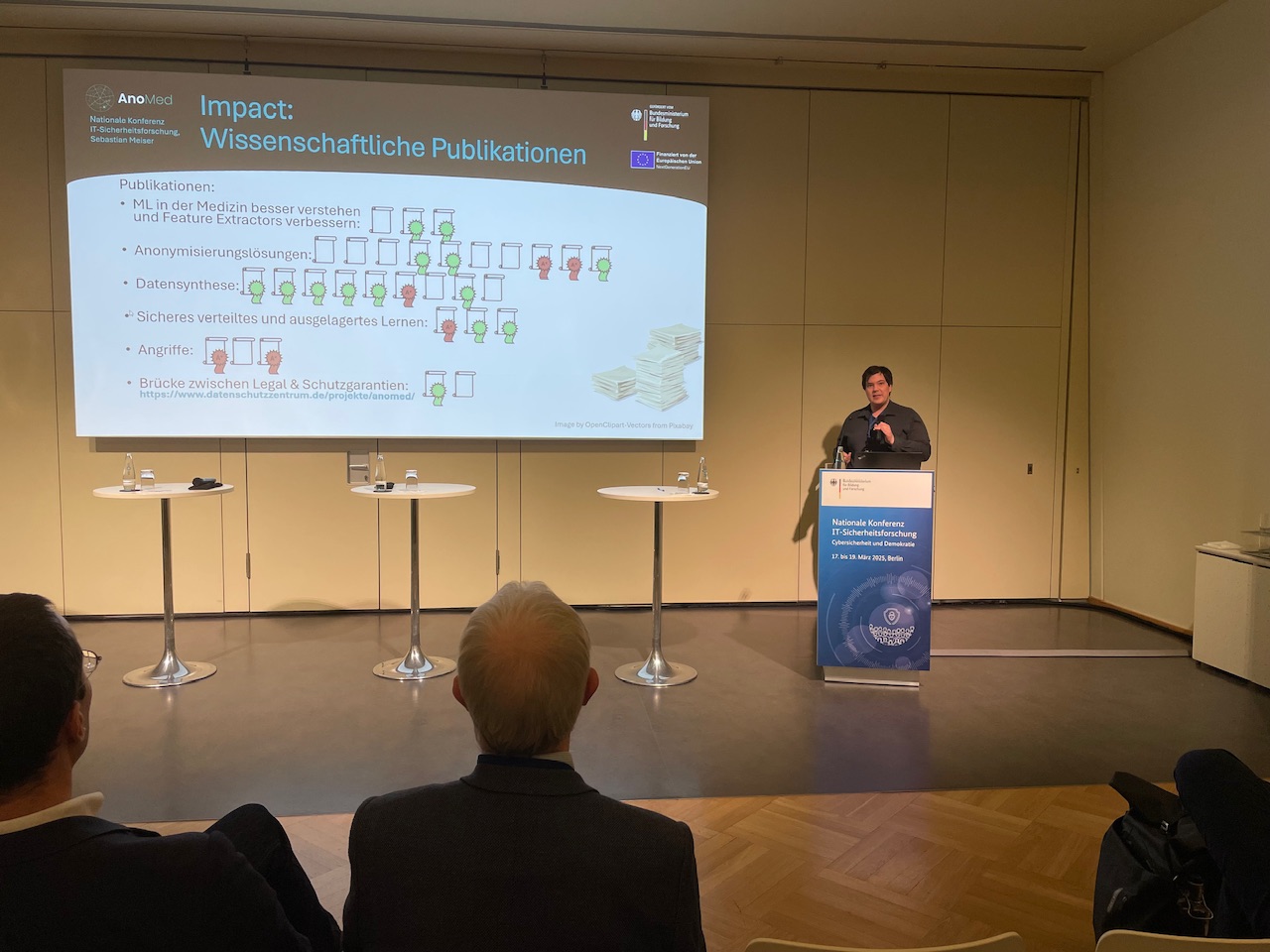 Das AnoMed-Cluster, als integraler Bestandteil des Forschungsnetzwerks Anonymisierung, präsentierte auf der Nationalen Konferenz zur IT-Sicherheitsforschung 2025 in Berlin seine aktuellen Forschungsergebnisse zur Anonymisierung medizinischer Daten. In einer eineinhalbstündigen Session stellten Vertreter des Clusters ihre neuesten Beiträge vor und nutzten die Gelegenheit zum wissenschaftlichen Austausch mit Experten aus Wissenschaft, Wirtschaft, Politik und Zivilgesellschaft.